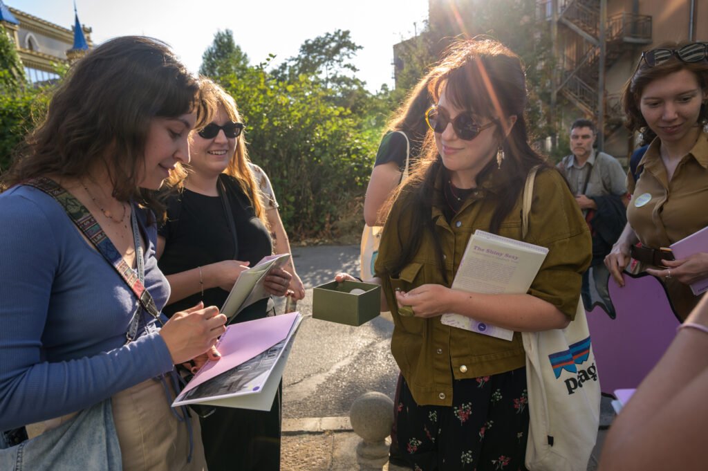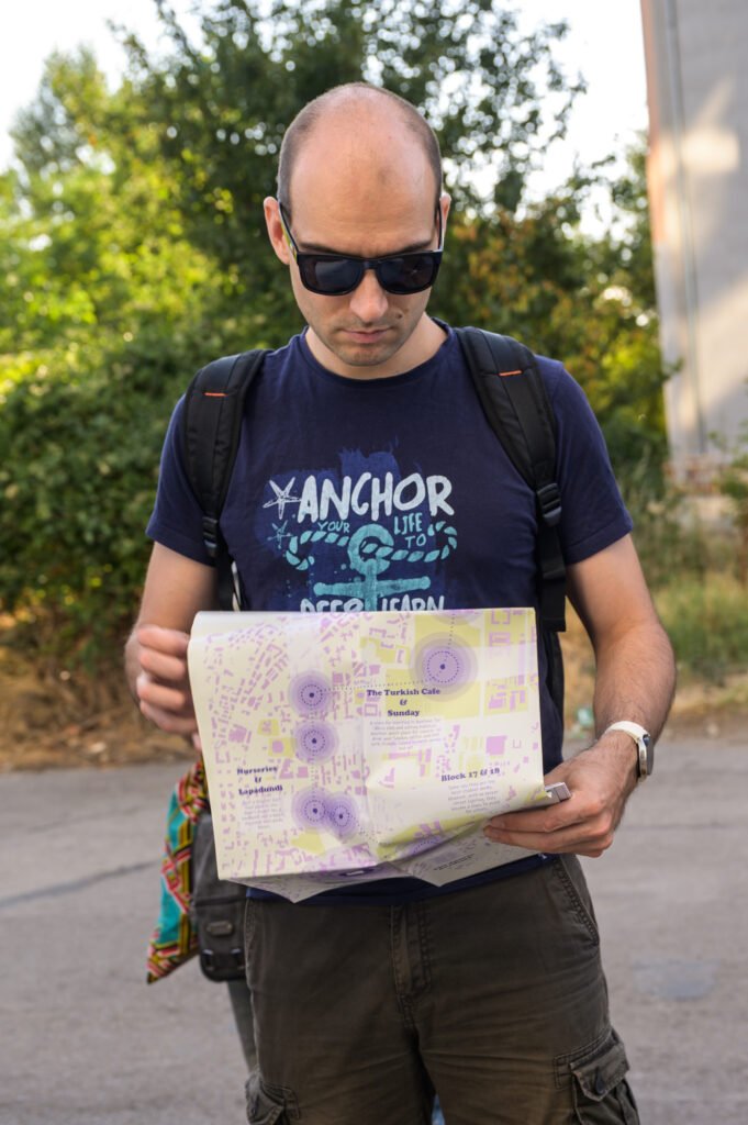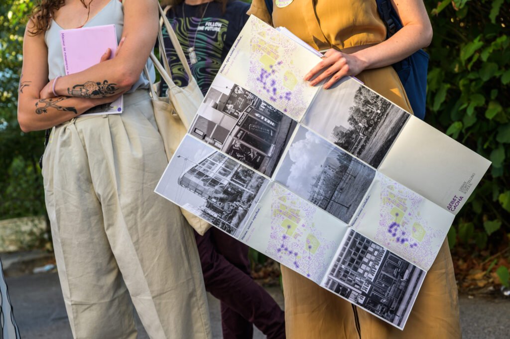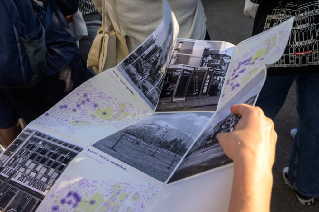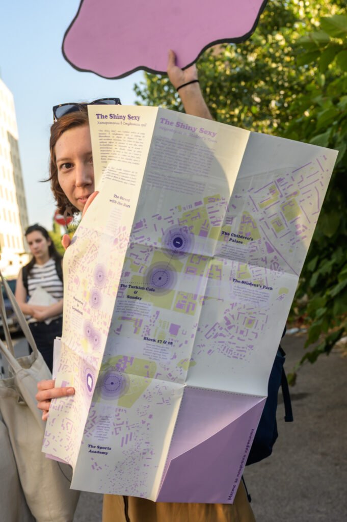 “The Shiny Sexy: Heterotopias in Student Town” is a walk-based research project that maps the layered everyday life of Student Town in Sofia through stories gathered from its inhabitants. The publication takes the form of a map accompanied by a series of postcards, each corresponding to a stop along the walk and offering visual, textual, and narrative fragments of the neighbourhood. Through interviews, observations, and collective storytelling, the project explores Student Town as a space of overlapping functions and identities—a contemporary heterotopia shaped by both its socialist origins and its present-day transformations. From dormitories and kindergartens to nightclubs, shops, and informal meeting points, the publication traces the contrasts and proximities that define the area.